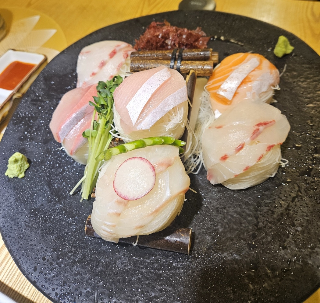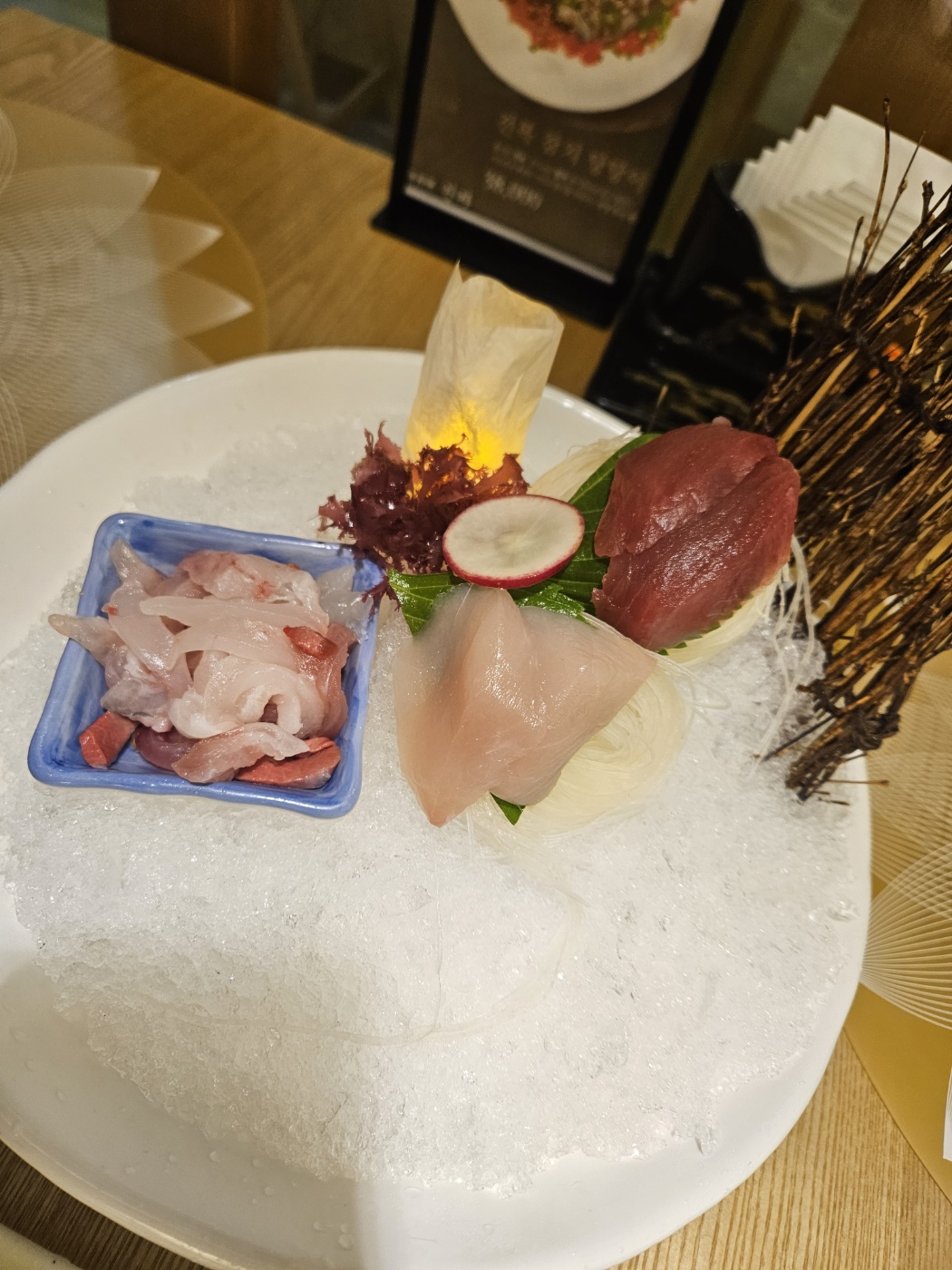 연어, 광어, 방어까지 회 종류가 다양하게 제공되었어요. 생선마다 각각 다른 식감과 맛을 느낄 수 있어서 만족스러웠어요.