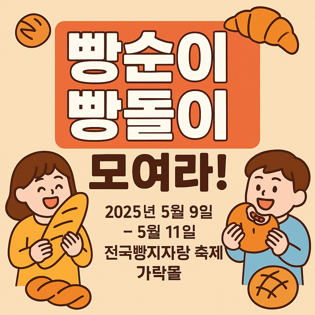 싶은 축제를 소개해드릴게요. 바로바로~ 2025 전국빵지자랑 축제가 오는 5월 9일부터 11일까지 3일간 서울 송파구 가락몰에서 열린다는 소식입니다! 빵순이, 빵돌이 분들에겐 정말 눈 돌아갈 만한 라인업이 준비돼 있고요, 가족과 함께, 연인과 함께, 친구들과 함께 가볍게 나들이하기 딱 좋은 행사예요 😊