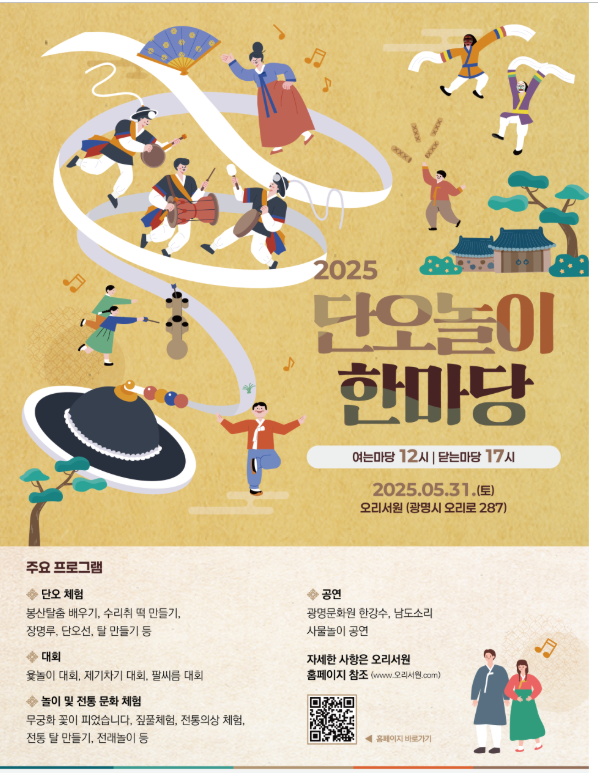 따뜻한 초여름 햇살 아래, 전통과 놀이가 함께하는 ‘2025 단오놀이 한마당’이 5월 31일(토)에 광명 오리서원에서 열립니다! 가족과 함께 단오의 멋을 즐기며, 직접 보고 만들고 체험하는 특별한 하루를 보내보세요.