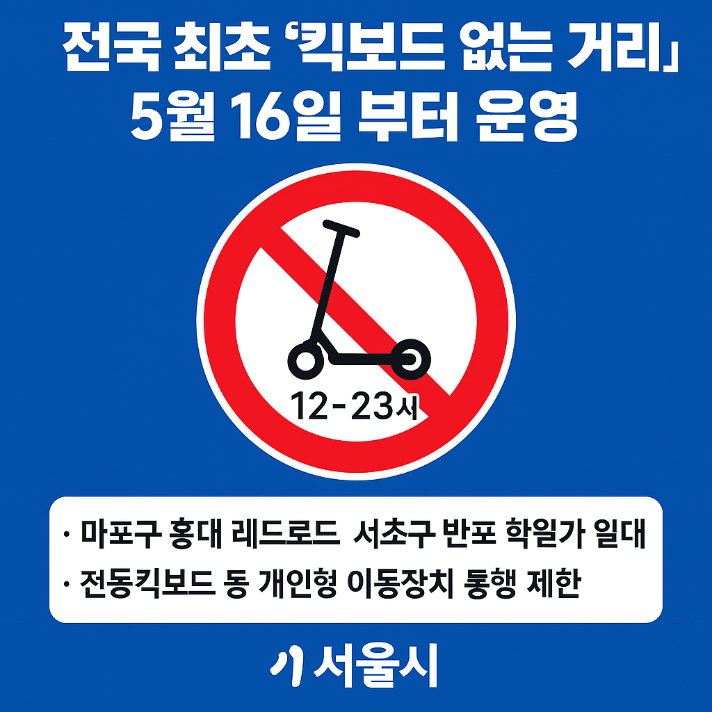 서울시가 전국 최초로 ‘킥보드 없는 거리’를 도입합니다. 2025년 5월 16일(금)부터 마포구 홍대 레드로드와 서초구 반포 학원가 일대에서 전동킥보드 등 개인형 이동장치(PM)의 통행이 제한됩니다.