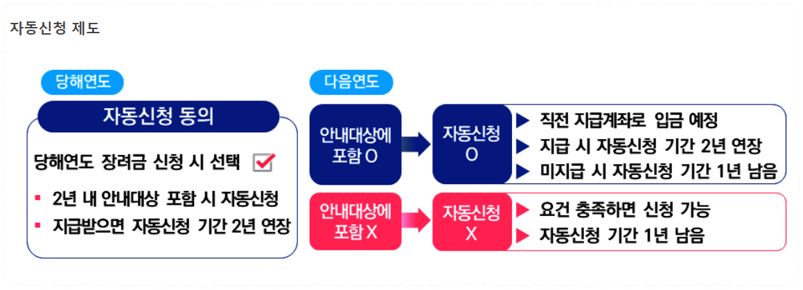 - 신청안내 대상자가 장려금 신청기간에 자동신청에 사전 동의하면 향후 2년간 안내대상에 선정될 경우 장려금이 자동으로 신청